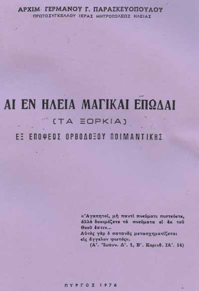 "... Οι κάτοικοι της Ηλείας ενώ είναι ευλαβείς και φιλόθρησκοι, πολλάκις δεν γνωρίζουν πώς να εκφράσουν την ευσέβειάν των προς τον Θεόν. Ούτω, θα ίδωμεν αυτούς κατά χιλιάδας να συγκεντρώνται εις τα Ιερά Προσκυνήματα της περιοχής, δια να εκζητήσουν την Χάριν και την δύναμιν του Θεού, αλλά παραλλήλως πολλάκις θα τους εύρωμεν διατηρούντας πλήθος προλήψεων και δεισιδαιμονιών ή καταφεύγοντας εις ποικίλας μαγικάς πράξεις και επωδάς. Αλλ' η χρήσις τούτων απομακρύνει τον Χριστιανόν εκ της Ορθοδόξου πίστεως και της πνευματικής λατρείας, εθίζει αυτόν μαγικώς να αντιμετωπίζη τα προβλήματα της ζωής και τον οδηγεί, εκουσίως ή ακουσίως, να γίνηται συνεργός του σατανά ή να επικαλείται την βοήθειάν του, με αποτέλεσμα να απομακρύνηται ασφαλώς της εν Χριστώ σωτηρίας..." (Από τον πρόλογο του βιβλίου).