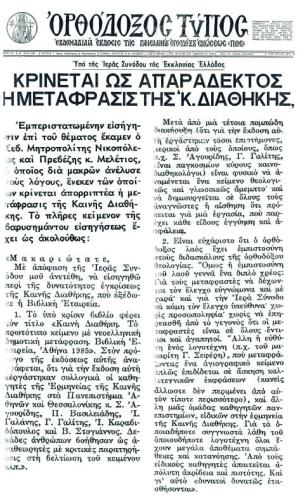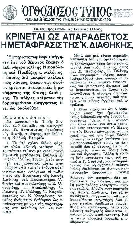 3.  Όμως ο άγιος Νικοπόλεως έχει δώσει παλαιότερα απάντησι σ' αυτά τα ερωτήματα. Έχει απαντήσει με εμπεριστατωμένη όντως εισήγησί του προς την Διαρκή Ιεράν Σύνοδον της Εκκλησίας της Ελλάδος, όταν εις αυτήν είχεν υποβληθή προς έγκρισιν υπό των εξ Καθηγητών και της εν Ελλάδι Βιβλικής Εταιρείας η σχετική μετάφρασις. Την Εισήγησιν αυτήν ανεύρον με την βοήθεια Αδελφού Αρχιερέως εις τα Φύλλα του ΟΡΘΟΔΟΞΟΥ ΤΥΠΟΥ της 31 Ιανουαρίου και 7 φεβρουαρίου 1986.