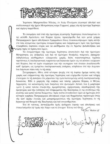 Ευχητήρια επιστολή Οικ. Πατριάρχου πρός τόν Σεβ. Μητροπολίτην Ηλείας διά τήν ονομαστικήν του εορτή