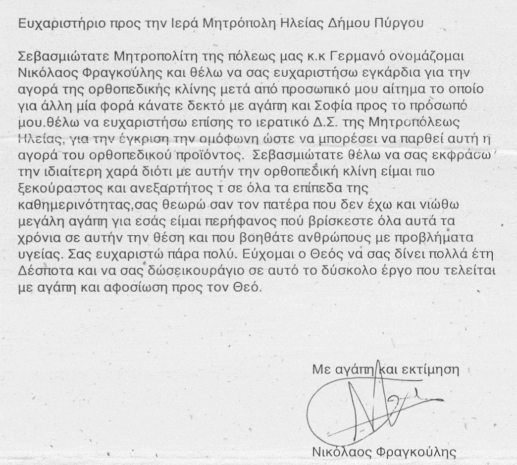 Ευχαριστήρια επιστολή απέστειλε προς τον Σεβασμιώτατον Μητροπολίτη μας κ.κ. ΓΕΡΜΑΝΟ ο κ. Νικόλαος Φραγκούλης δια την αγορά μιας ορθοπεδικής κλίνης.