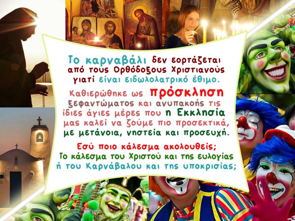 Αγαπητοί μας οδεύουμε πλέον εις την Τρίτη Κυριακή του Τριωδίου και από την Κυριακή των Απόκρεω, μέχρι και την Κυριακή της Τυρινής, σε πολλές πόλεις και χωριά της χώρας μας και της περιοχής μας οι άνθρωποι επιδίδονται και συμμετέχουν σε Καρναβαλικές και Ειδωλολατρικές εκδηλώσεις στις οποίες συμμετέχουν δυστυχώς και Ορθόδοξοι Χριστιανοί. Δεν είναι δε διόλου τυχαίο που οι Άγιοι της Ορθόδοξης Εκκλησίας μας αποκαλούν το Καρναβάλι «Σατανική πομπή». Ο Άγιος Νικόδημος ο Αγιορείτης αναφέρει πως στις Αποκριές «οι Χριστιανοί δαιμονίζονται όλοι, γιατί χορεύουν, παίζουν, τραγουδούν ασυνείδητα, έως και αυτοί οι πλέον γέροντες. Τότε πανηγυρίζει η ασέλγεια, εορτάζει η ακολασία, ευφραίνεται η μέθη, αγάλλεται η τρυφή και η αστεία, χορεύει ο διάβολος με δέκα μαντήλια και συγχορεύει με αυτόν και όλο το πλήθος των Δαιμόνων, γιατί όσα κερδίζουν μόνο την περίοδο των Απόκρεων, δεν μπορούν να το κερδίσουν οι δαίμονες όλο τον χρόνο. Δυστυχώς στην Ορθόδοξη Ελλάδα μας ενώ θα έπρεπε να υπάρχει ο ανάλογος σεβασμός στον Πανάγαθο Θεό μας και να εκλείψουν αυτές οι μορφές ηθικής σήψης, αναβιώνουν με τον χειρότερο τρόπο. Μεγάλο μέρος του λαού μας συμμετέχει στην καλοστημένη παγίδα του Διαβόλου, τον Καρνάβαλο. Ξοδεύονται αμύθητα ποσά ενώ υπάρχουν συνάνθρωποί μας που υποφέρουν από την ανεργία, από την πείνα κ.λ.π.Εμείς οι Ορθόδοξοι Χριστιανοί τώρα διερχόμαστε την περίοδο του Ιερού Τριωδίου, προετοιμαζόμαστε δε για το στάδιο της Αγίας και μεγάλης Τεσσαρακοστής και η Ορθόδοξη Εκκλησία μας κατά την περίοδο αυτή μας προβάλλει τρία βασικά πράγματα. Το πρώτο είναι η Προσευχή. Το δεύτερο η Νηστεία και το τρίτο και σπουδαιότερο η Μετάνοια με την Θεία Εξομολόγηση. Ενώ από τη μία μεριά μας ετοιμάζει η Ορθόδοξη Εκκλησία μας πνευματικώς, δίδοντας όλα εκείνα τα μέσα για να αγωνιστούμε τον αγώνα τον καλό, εμείς συμμαχούμε με τον εχθρό τον διάβολο και ετοιμαζόμαστε για χορούς... και ξεφαντώματα... Σε μία περίοδο μάλιστα λιτότητας και οικονομικής κρίσεως για την χώρα μας που η οικονομική κρίση έχει πλήξει όλες τις κοινωνικές τάξεις, Δήμοι και τοπικά Δημοτικά διαμερίσματα, θα ξοδέψουν και πάλι δυστυχώς κονδύλια ολόκληρα για να οργανώσουν όσο το δυνατόν καλύτερα τον Καρνάβαλο του Διαβόλου. Σε τέτοιους κρίσιμους καιρούς αγαπητοί μας επιτρέπονται τέτοιου είδους σπατάλες και ξεφαντώματα; Νομίζουμε ότι είναι πλέον καιρός να σοβαρευτούμε. Διαφορετικά, θα είμαστε άξιοι της τύχης μας. Για όσα τυχόν δεινά θα επακολουθήσουν θα φταίμε αποκλειστικά εμείς. Για αυτό λοιπόν ας πούμε πλέον ΝΑΙ στην παραγγελία του Θεού και ΟΧΙ στον Καρνάβαλο της Ειδωλολατρίας και της Σατανολατρίας. «Ας πετάξουμε λοιπόν τα έργα του σκότους και ας οπλιστούμε με τα όπλα του φωτός». όπως ακριβώς μας προτρέπει ο Απόστολος Παύλος. Ας είναι η συμπεριφορά μας σεμνή. Κάτω από τις μάσκες είναι η υποκρισία. Είναι δε χαρακτηριστικό και πράγματι έξυπνο αυτό που έγραψε κάποιος σε ένα τοίχο: « ΜΑΣΚΑΡΑΣ ΕΙΜΑΙ ΚΑΘΕ ΗΜΕΡΑ ΔΕΝ ΧΡΕΙΑΖΕΤΑΙ ΝΑ ΤΟ ΕΟΡΤΑΖΩ ΚΙΟΛΑΣ»!!Λησμονήσαμε αγαπητοί μία υπόσχεση, που δώσαμε κατά την ώρα του Ιερού Βαπτίσματος: «Αποτάσσομαι τω Σατανά και πάση τη πομπή αυτού». Πως είναι δυνατόν να συμμετέχουμε σε εκδηλώσεις καρναβαλικές και ειδωλολατρικές, όταν η Ορθόδοξη Εκκλησία μας καταδικάζει αυτές τις αμαρτωλές εκδηλώσεις. Αντί αυτού μας καλεί σε πνευματική περισυλλογή για να προετοιμαστούμε και να δεχθούμε μ