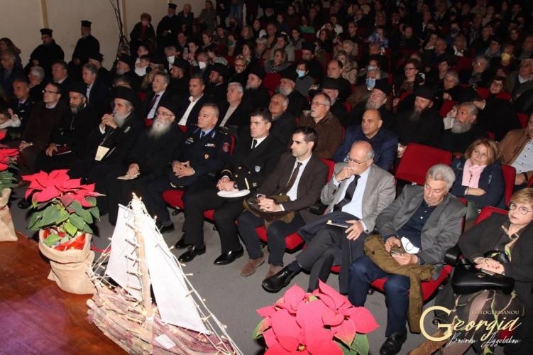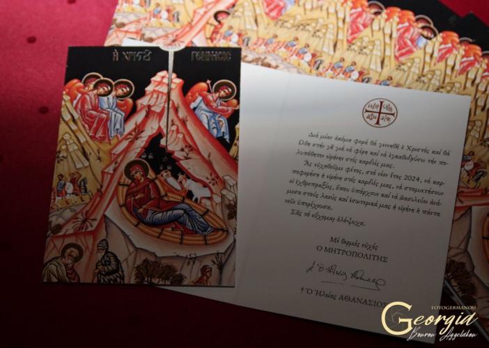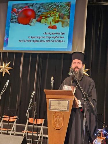 Λίγο πριν την ολοκλήρωση της εκδήλωσης ο ποιμενάρχης μας έδωσε αναμνηστικά δώρα στον Πρωτοσύγκελο της Ι.Μ. Γόρτυνος και Μεγαλουπόλεως αρχιμανδρίτη Ιάκωβο Κανάκη καθώς και στον ηθοποιό Παναγιώτης Σταθακόπουλο εκφράζοντας έτσι τις ευχαριστίες της Ι.Μ. Ηλείας και Ωλένης για την συμβολή τους στην υλοποίηση της εκδήλωσης αυτής. Στην συνέχεια ο μητροπολίτης κ.κ. Αθανάσιος απηύθυνε ευχές για καλά και ευλογημένα Χριστούγεννα και το μαγικό αυτό ταξίδι ολοκληρώθηκε με τη φήμη του μητροπολίτη που έψαλλε η βυζαντινή χορωδία της Μητροπόλεως Ηλείας και Ωλένης.