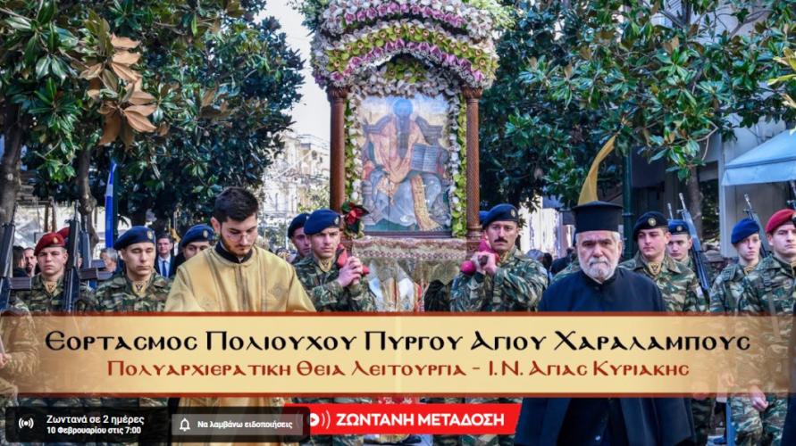 Τις εκδηλώσεις που θα λάβουν χώρα στον Ιερό Ναό Αγίας Κυριακής Πύργου με αφορμή τη Θρησκευτική Πανήγυρη του Αγίου Ενδόξου Ιερομάρτυρος Χαραλάμπους, Πρωστάτου και Πολιούχου της Πόλεως του Πύργου, θα μεταδώσει σε ζωντανή σύνδεση το site της Ιεράς Μητροπόλεως Ηλείας και Ωλένης την Κυριακή 9 Φεβρουαρίου 2025 και την Δευτέρα 10 Φεβρουαρίου 2025 σε συνεργασία με το ilialive.gr. και το τηλεοπτικό σταθμό ΙΟΝΙΑΝ TV