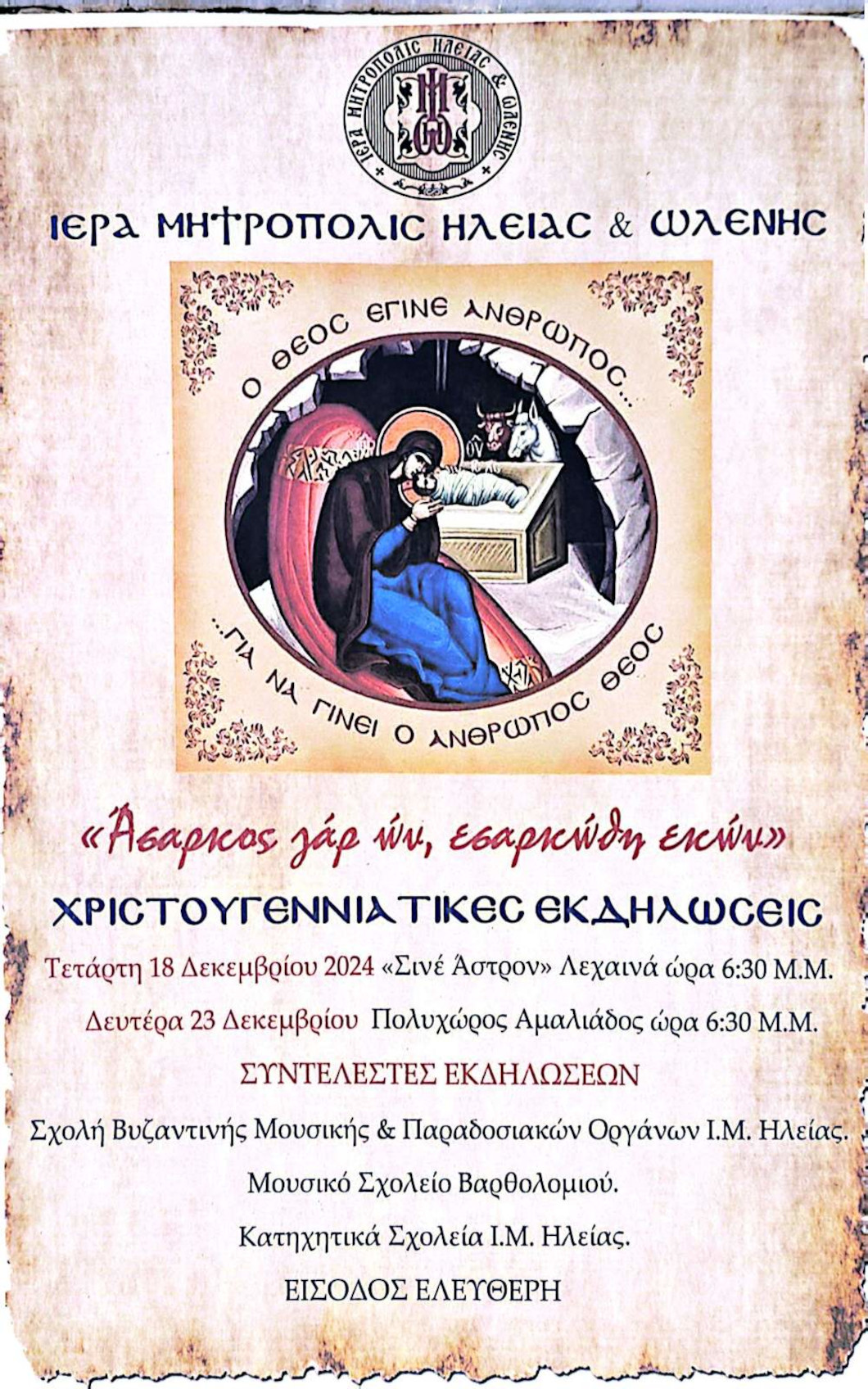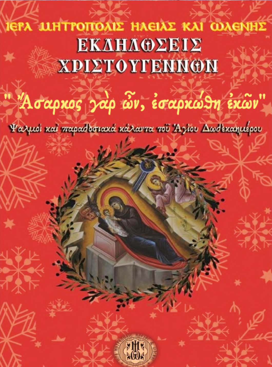 Χριστουγεννιάτικες εκδηλώσεις," Ἄσαρκος γὰρ ὧν, ἐσαρκώθη ἐκῶν", θα πραγματοποιήσει η Ιερά Μητρόπολις Ηλείας και Ωλένης, εν όψει της φωτοφόρου εορτής των Χριστουγέννων οι οποίες θα λάβουν χώρα στις 18 και 23 Δεκεμβρίου 2024.