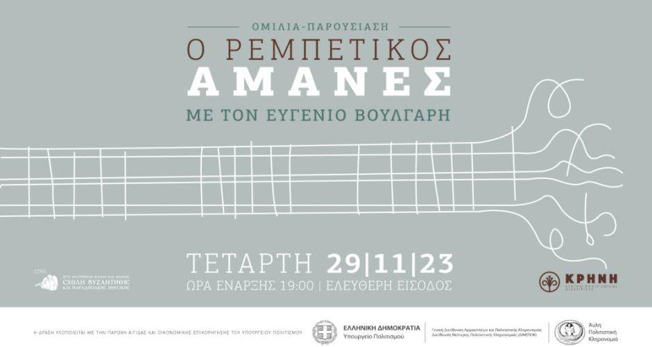 Την Τετάρτη 29 Νοεμβρίου 2023 στις 19.00 στη Σχολή Βυζαντινής και Παραδοσιακής Μουσικής Ι.Μ. Ηλείας & Ωλένης (αίθουσα Αποστολικής Διακονίας | Πλατεία Σάκη Καράγιωργα, απέναντι από τον Ιερό Ναό Αγ.Νικολάου Πύργου) θα πραγματοποιηθεί μία διάλεξη – παρουσίαση για τη φόρμα του Αμανέ στις ηχογραφήσεις του Ρεμπέτικου από τον διακεκριμένο μουσικό Ευγένιο Βούλγαρη.