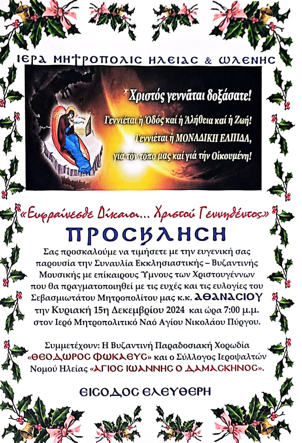 Συναυλία Εκκλησιαστικής – Βυζαντινής Μουσικής με επίκαιρους Ύμνους των Χριστουγέννων θα πραγματοποιηθεί την Κυριακή 15 Δεκεμβρίου 2024 στο Μητροπολιτικό Ναό Αγίου Νικολάου Πύργου, με τις ευχές και ευλογίες του Σεβασμιωτάτου Μητροπολίτου μας κ.κ. ΑΘΑΝΑΣΙΟΥ.