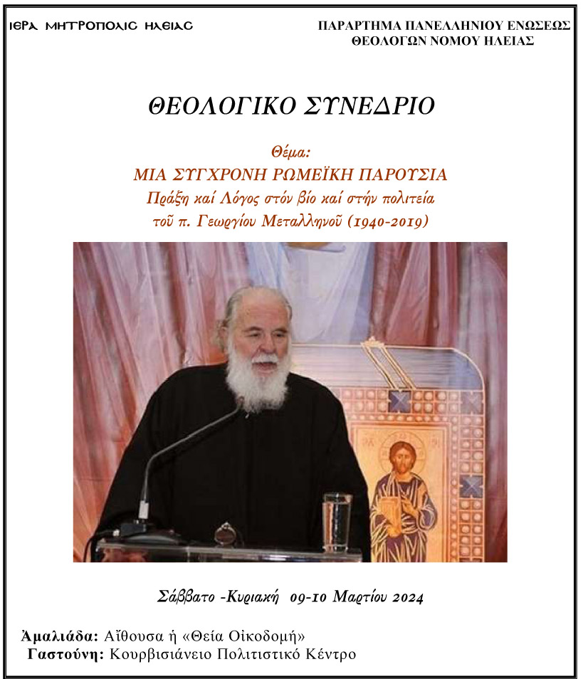 Θέμα τοῦ φετινοῦ Θεολογικοῦ Συνεδρίου εἶναι: "ΜΙΑ ΣΥΓΧΡΟΝΗ ΡΩΜΕΪΚΗ ΠΑΡΟΥΣΙΑ - Πράξη καί Λόγος στόν βίο καί στήν πολιτεία τοῦ π. Γεωργίου Μεταλληνοῦ (1940-2019)"