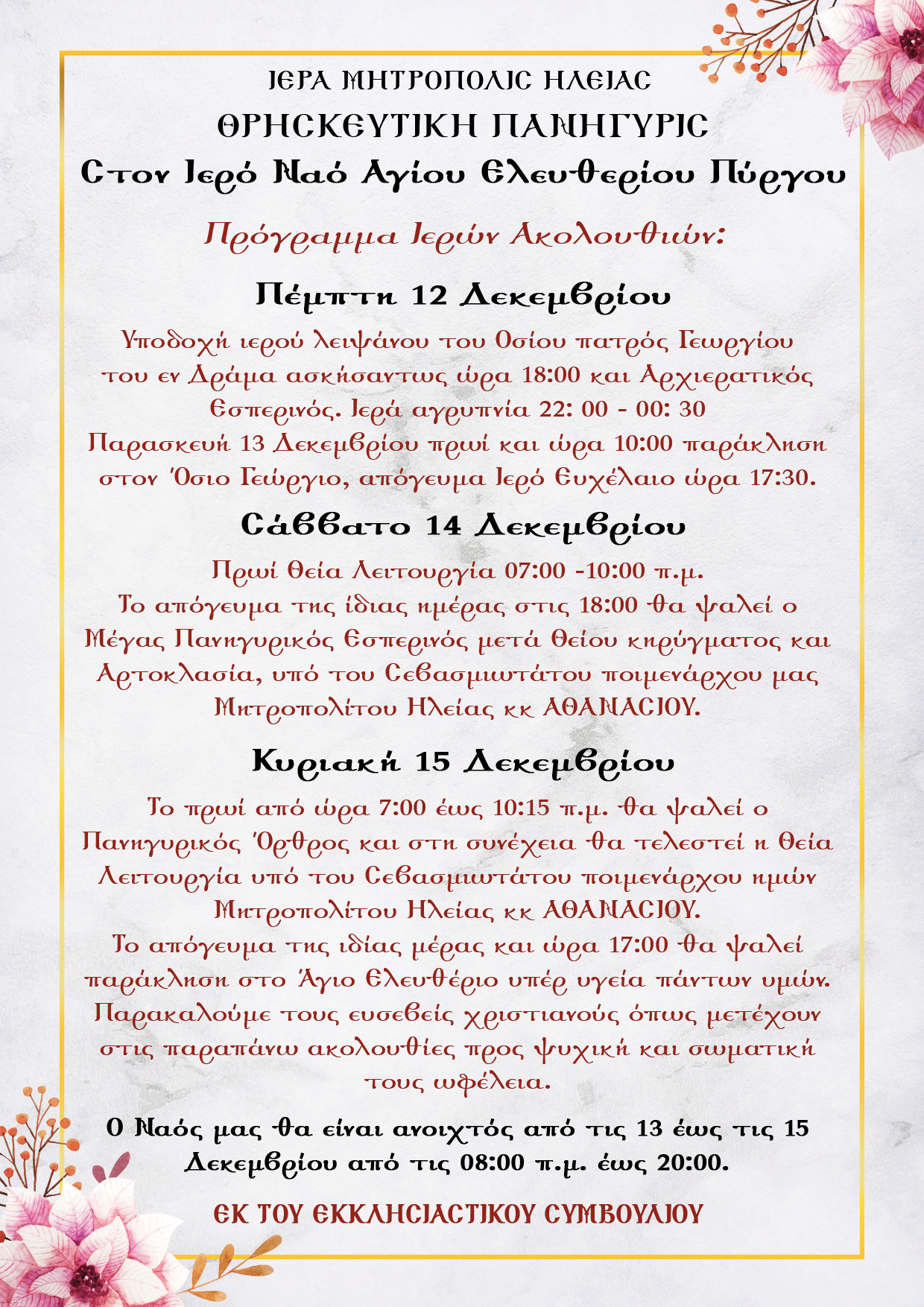 ΘΡΗΣΚΕΥΤΙΚΗ ΠΑΝΗΓΥΡΙΣ ΕΙΣ ΤΟΝ ΙΕΡΟΝ ΝΑΟΝ ΑΓ. ΕΛΕΥΘΕΡΙΟΥ ΠΥΡΓΟΥ